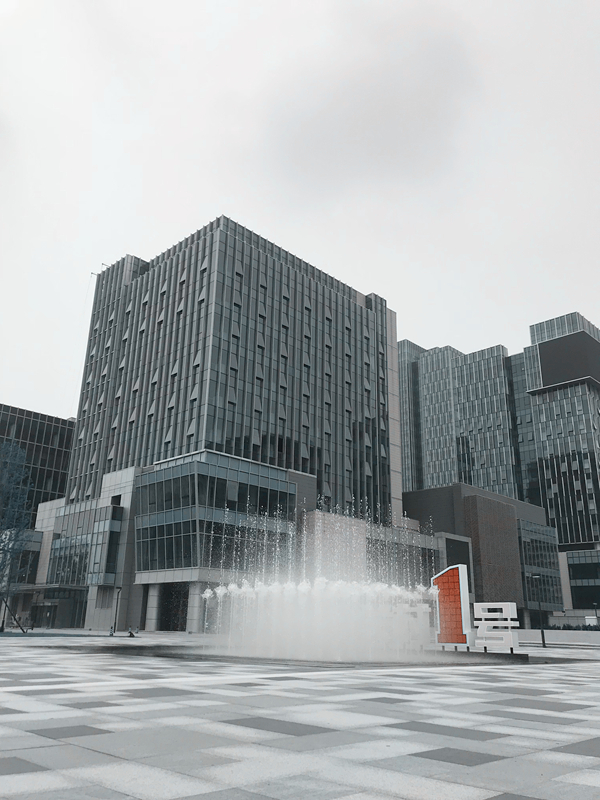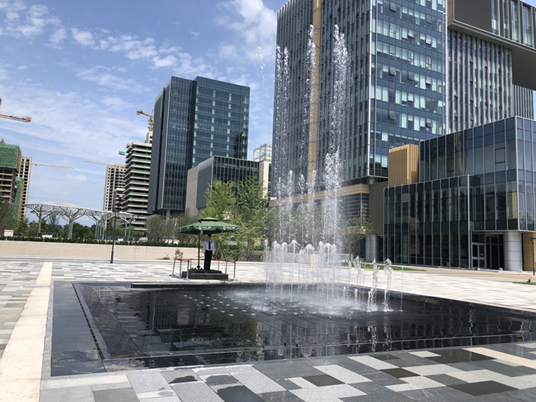 我們在此處建了一處動靜集合的水景,呈鏡面水景時,水面倒映出蔚藍的天空。